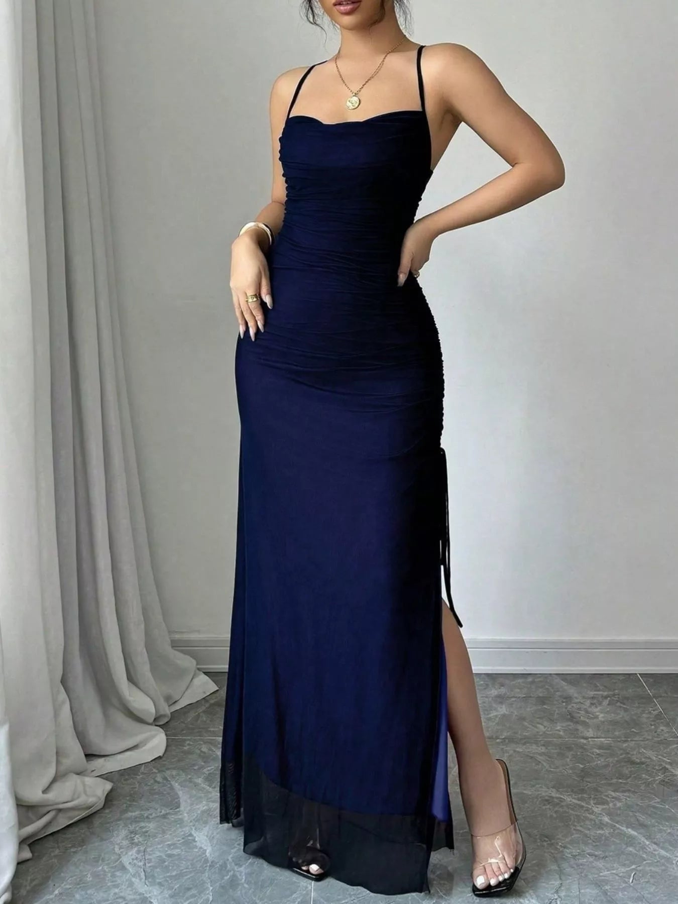 • Features:Ruched,Slit,Drawstring
